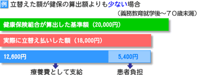 また、実際に立替えた額が算出した基準額を下回る場合には、その低いほうの額から一部負担金相当額を差し引いた金額が支払われます。