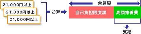同じ世帯で、同じ月に、自己負担額が21,000円以上のものが2件以上あった場合は、それらを合算した額が自己負担限度額を超えた分について、高額療養費が支給されます。